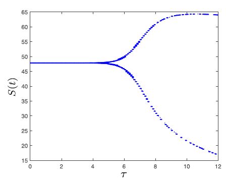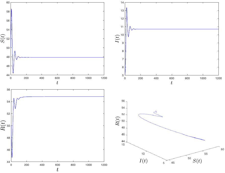 .In this section, several illustrative numerical examples are presented to confirm the the- oretical results and to examine the dynamical behavior of system (2). All the figures are plotted by using Matlab 2018a. From Section 4 we can find that delay