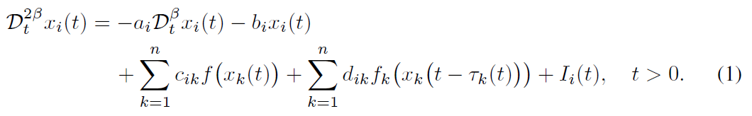 Consider following Caputo fractional-order inertial neural network with time delays: