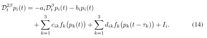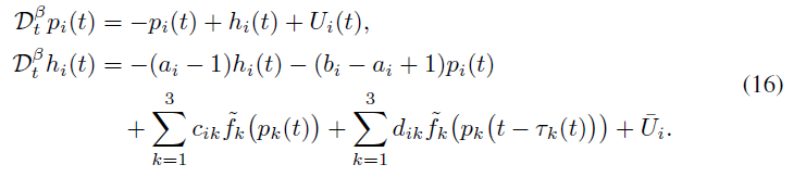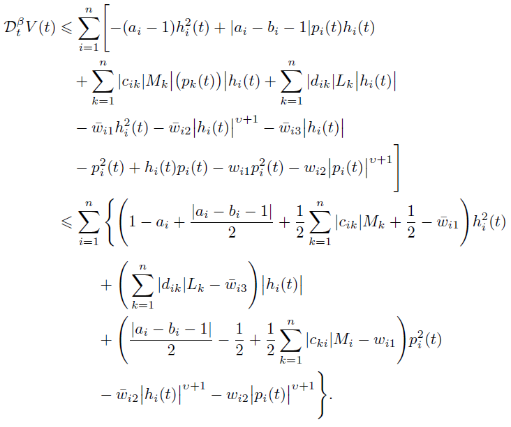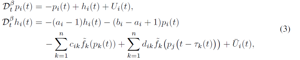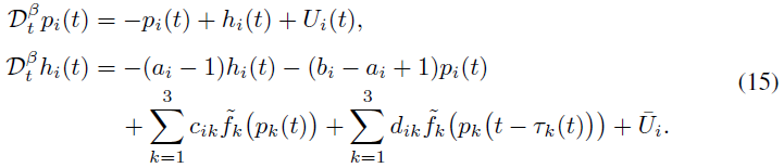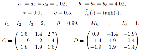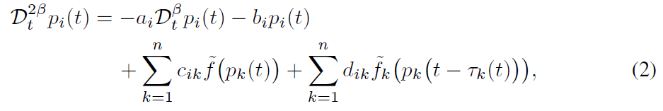 (ii) Different from the existing works, the fractional-order inertial neural networks is different from integer-order delayed inertial neural networks models in [12, 13], so those results cannot be directly applied to system given in this paper.