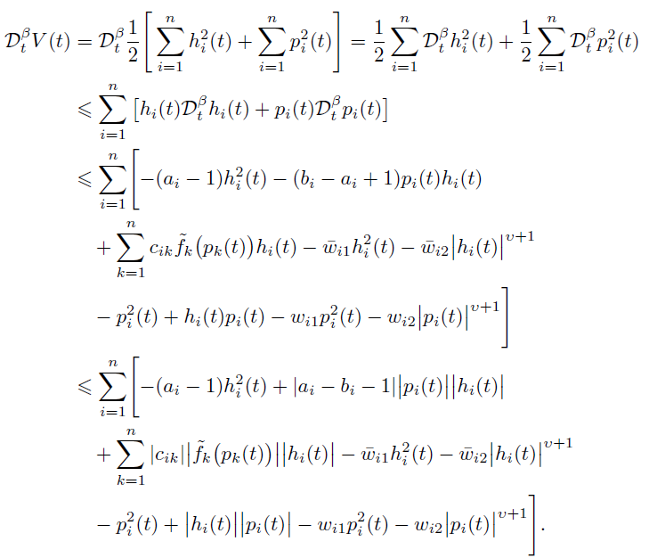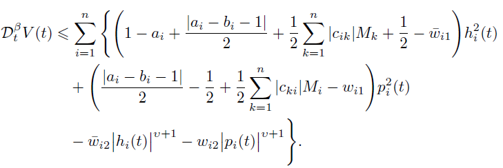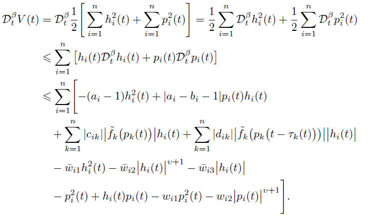 Remark 3. Up to now, stability and synchronization for integer-order inertial neural networks with delay have been intensively studied [13]. In this paper, finite-time stabilization for fractional-order inertial neural networks with time-varying delays are investigated. Note that when β = 1, fractional-order inertial neural network will be reduced to integer-order inertial neural network. Therefore, integer-order inertial neural network can be seen as a special case of fractional-order inertial neural networks. The model proposed in this paper is less conservative and more general.