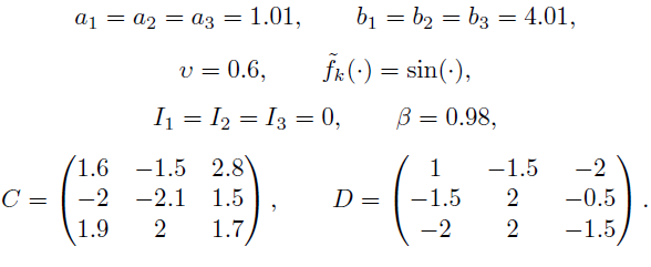 Remark 5. Our results on finite-time stabilization are derived based on the Lyapunov direct method and feedback controller, which are more concise and easy to verify than those obtained in the existing papers by using linear matrix inequality [24, 32], the matrix measure method and Halany inequality techniques [12].