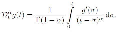 Definition 1. (See [30].) The Caputo fractional derivative with noninteger order α > 0 of function g(t) is defined as follows: