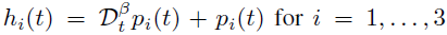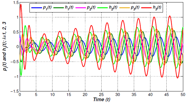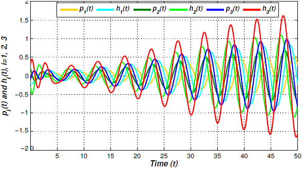 Remark 1. It should be noted that the setting time T can be theoretically determined according to the equality 9 in Theorems 1 and 2. In 9, we see that the setting time T not only depends on the initial states h(0) and p(0), but also depends on the fractional order β, parameters υ and a.