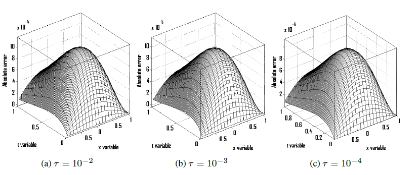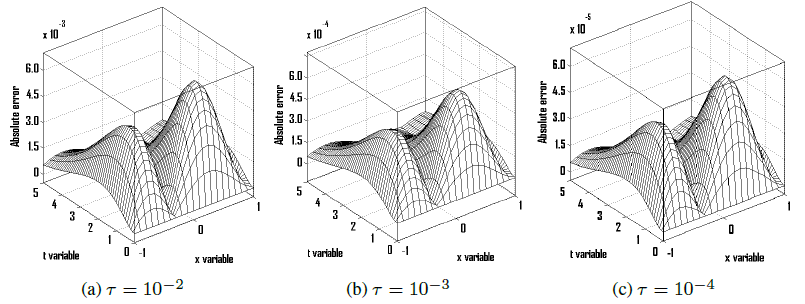 To solve the above problem, we applied the Rothe–Legendre pseudospectral method described in Sections 2 and 3. In Fig. 1, we plot the absolute error as a function of x and t with fixed polynomial degree N = 12 and various step time τ . The results shows that the approximate and exact solutions are in good agreement, that demonstrates the effectiveness of the proposed algorithm.