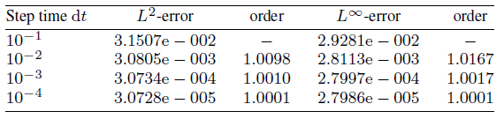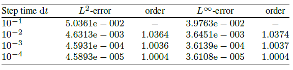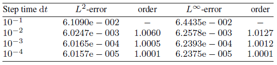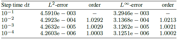 Next, we check the convergence rates of the temporal discretization. As it done in the previous example, we fix the polynomial degree M = 4, and let step time τ vary as 10−k. Tables 4 and 5 show that error decreases as the time step τ becomes smaller and as expected convergence order of temporal discretization is (τ ). That is not surprising since the backward Euler schema used in time discretization is only of first order.