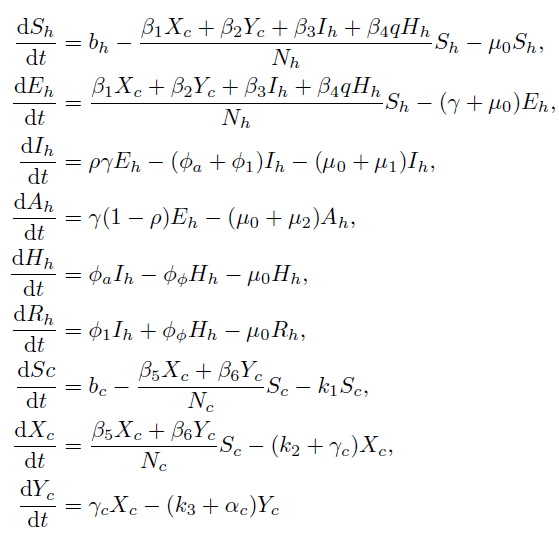 In this section, we develop a compartmental epidemic model of Middle Eastern respira- tory syndrome coronavirus (MERS-CoV). According to biological characteristics of the MERS-CoV, we divide the total population into human and camel populations. Sh(t) is susceptible human, Eh(t) is the exposed human, Ih(t) is symptomatic and infectious hu- man, infectious but asymptotic class human Ah(t), hospitalized human Hh(t), recovery class Rh(t), Sc(t) is susceptible camel, Xc(t) is asymptomatic infected camel, and Yc(t) is symptomatic infected camel. Keeping the characteristic of Middle Eastern respiratory syndrome coronavirus (MERS-CoV) along with the above characterization leads to the following system of ordinary differential equations: