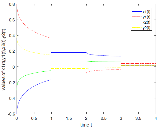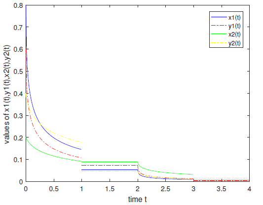 According to Example 1, the above system is practically stable. Numerical simulation can be seen in Fig. 1.