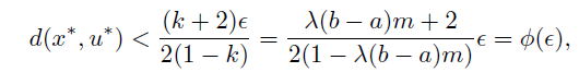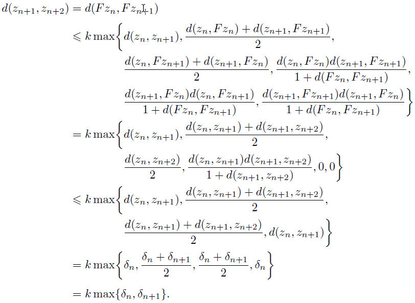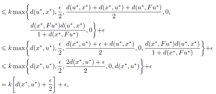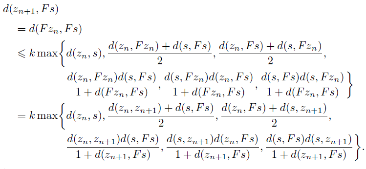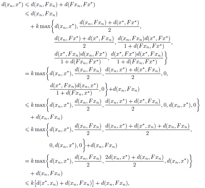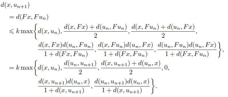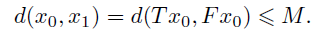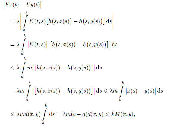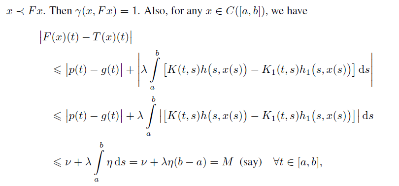 which implies that sup.∈[a,b] |. (.)(.) − . (.)(.)| ≤ . for all . ∈ .([a, b]). So, .(Fx, Tx) ≤ . for all . ∈ .. Thus, all the hypothesis of Theorem 5 are met. Therefore, we have .(x, x.) ≤ M/(1 − .) = (. + λη(. − .)).(1 − .(. − .).).