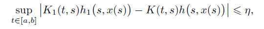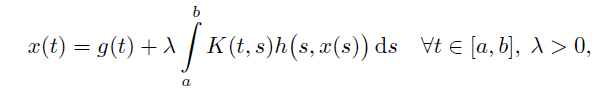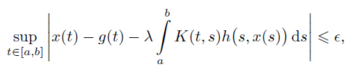Definition 14. Let .. .([a, b]) be the unique solution of the integral equation (19) and .. be the solution of the integral equation .(.) = .(.) + . ∫ b K .t, s). (s, x(.)) d. for all . ∈ [a, b], where . ∈ .[a, b] and .. : [a, b] ×R → [0, ∞), .. : [a, b] ×[a, b] → [0, ∞) are continuous mappings. The problem of data dependence is to find sup.∈[a,b] |..(.) − ..(.)|.