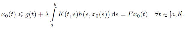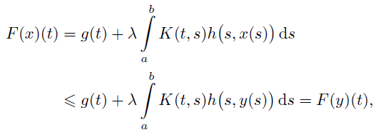 (26)Since . is a solution of (25), it is a fixed point of the mapping . defined by (26). By the assumption of the theorem we have .(.) ≤ . (.)(.), . ∈ [a, b], which implies that