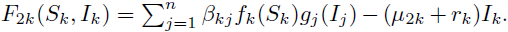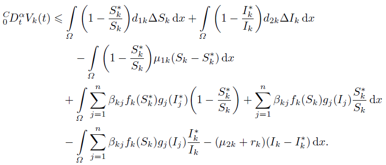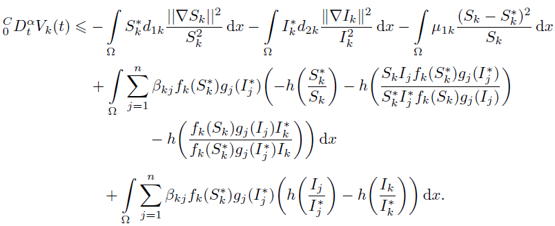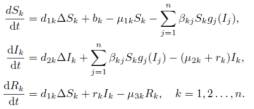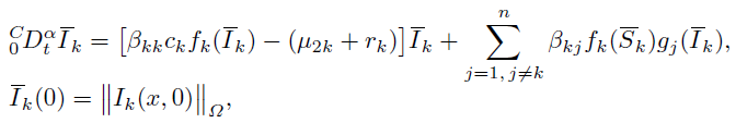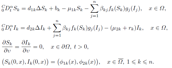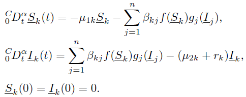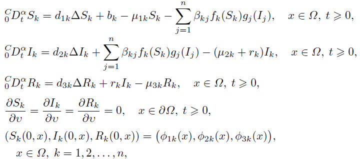 (5)Based on the previous analysis, since fractional order has the long-term memory, which can describe the spread of infectious diseases more accurate. In addition, it is traditionally assumed that the incidence of disease transmission is bilinear with respect to the number of susceptible individuals and the number of infected individuals. But in reality, it is often difficult to obtain detailed information on the spread of infectious diseases because they may change with the surrounding environment. Therefore, the general incidence rates will be chose in this paper. Motivated by the above work, as an extension of system (5), a class of multigroup SIR epidemic model are investigated as follows: