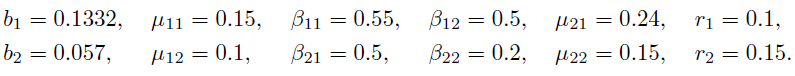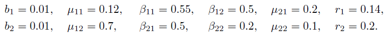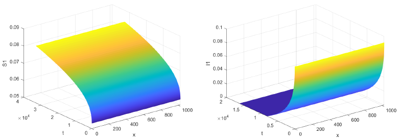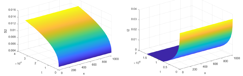In order to verify theoretical results numerically, numerical simulations are presented in this section. We consider system (7) with two-group case, which is suitable for infectious diseases transmitted between two cities or communities. Furthermore, system (7) with two groups (n = 2) can be calculated by the central difference method in L1-type space and Alikhanov-type discretization in time [9]. Furthermore, we consider the following incidence rate as an example: