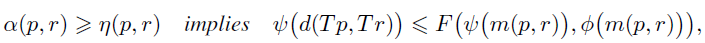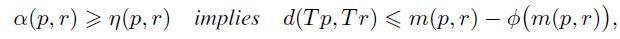 Theorem 1. Let (M, d) be a complete Hausdorff rectangular metric space, and let T : M → M be an α-admissible mapping with respect to η. Suppose there exist F ∈ C and ψ, φ ∈ Ψ such that, for p, r ∈ M,