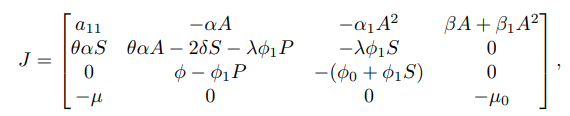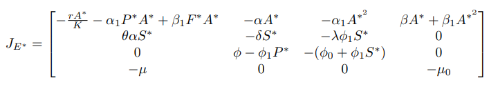 Evaluating the Jacobian J at the equilibrium E1, we get the eigenvalues as