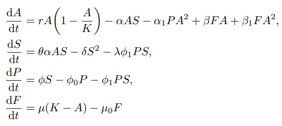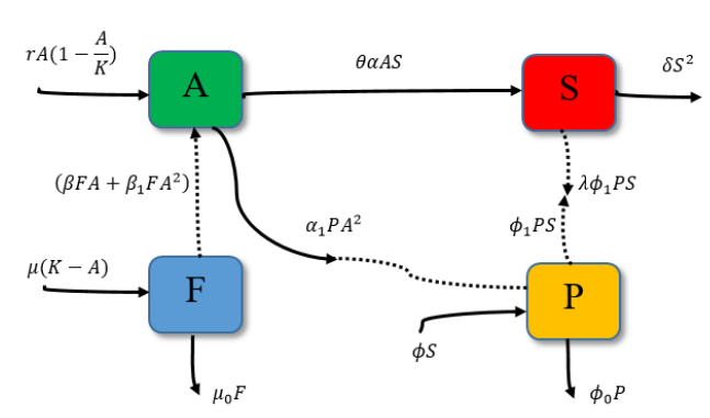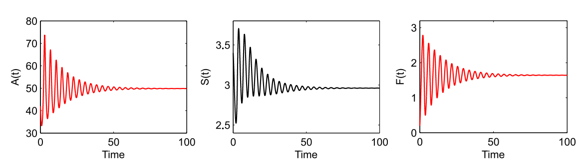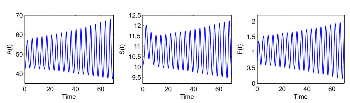Further, we plot the variation of A(t), S(t), and F(t) with respect to time t for φ = 0.027 < φc and see that dynamical variables have undamped sustained oscillations showing the instability of equilibrium E∗ ; see Fig. 6.
