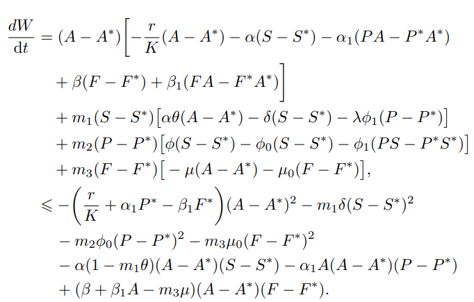 Now, we discuss the global stability of the equilibrium E∗ inside the region of attraction. The equilibrium point E∗ is globally asymptotically stable if it is asymptotic stable for all initial start inside the region of attraction. Here, we use the Lyapunov’s stability theory to determine the global stability of E∗. For this, we have obtained the following result regarding the global stability of E∗ .