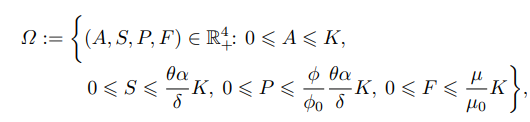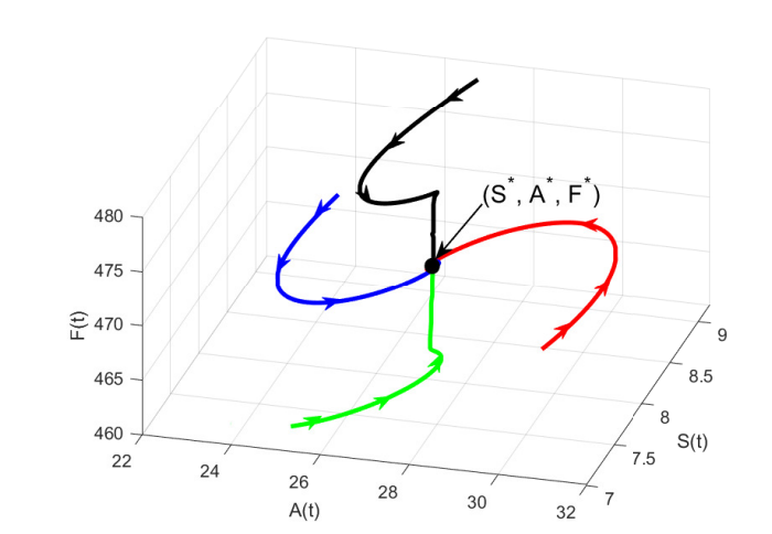 To visualize the global stability of interior equilibrium E∗ , we plot the solution trajectories of system (1) with different initial starts in S,A,F-space for α1 = 0.00001, β = 0.00001, β1 = 0.0000001, φ1 = 0.0005, and rest of parameter values are same as given in Table 1, and check that the global stability conditions stated in the Theorem 2 are also satisfied for these parameter values. We may observe that the solution trajectories starting inside region of attraction approach towards the (S∗, A∗ ,F∗) in S,A,F-space, which shows that E∗ is globally asymptotically stable in this space; see Fig. 3