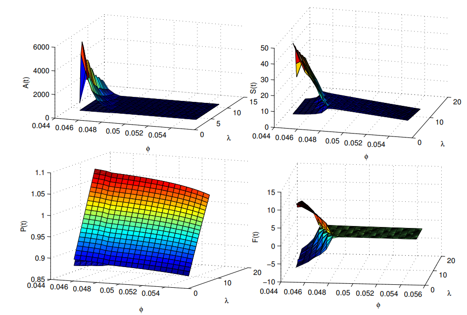 Bifurcation diagram of crop production A(t), insect population S(t), insecticide P(t) and external efforts F(t) with respect to φ and λ, other parameters are same as given in Table1