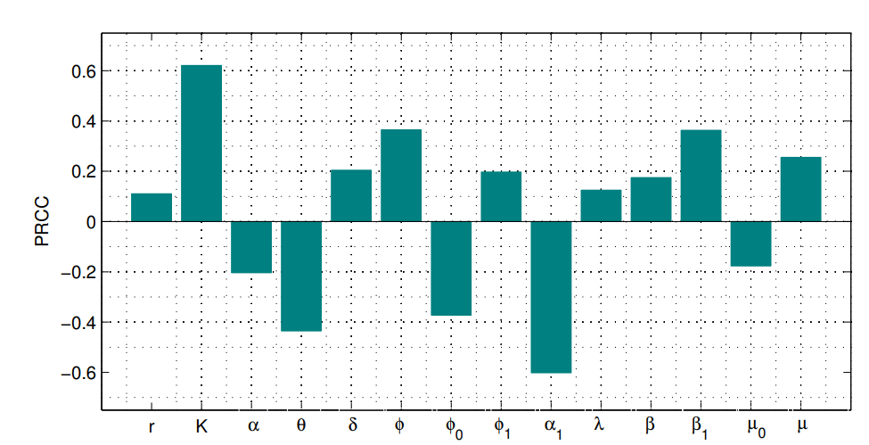 In this section, we use a global sensitivity analysis to identify the most influential parameters that have significant impact on the variables of system (1) by giving a number between −1 and +1 [1, 11]. The positive sign of number depicts the positive correlation between the parameter and variable, while negative sign as negative correlation. The value of number depicts the strength of correlation. Assuming a uniform distribution for each parameter, we calculate the Partial Rank Correlation Coefficients (PRCCs) for the parameters