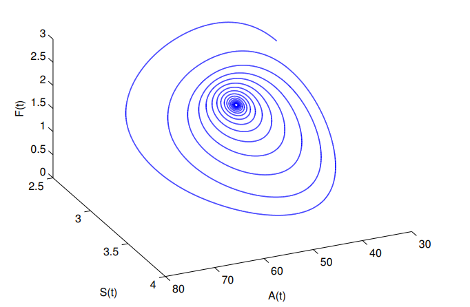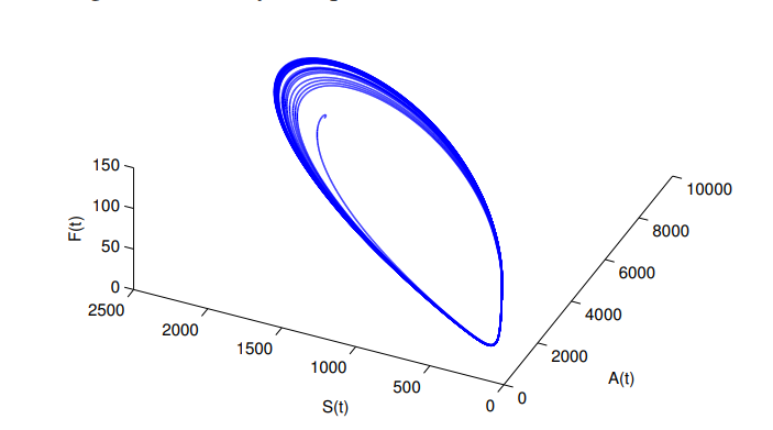 In Fig. 7, we plot a solution trajectories for φ = 0.027 in A,S,F-space starting near the interior equilibrium in A,S,F-space and see that it goes further away from interior equilibrium, shows that the interior equilibrium is unstable