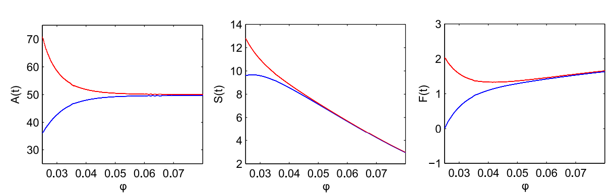 We see the variation of crop production A(t), insect population S(t) and external efforts F(t) with respect to time t for φ = 0.08 > φc, which is shown in Fig. 4. This figure reveals that for φ > φc, all the dynamical variables attain their equilibrium values.