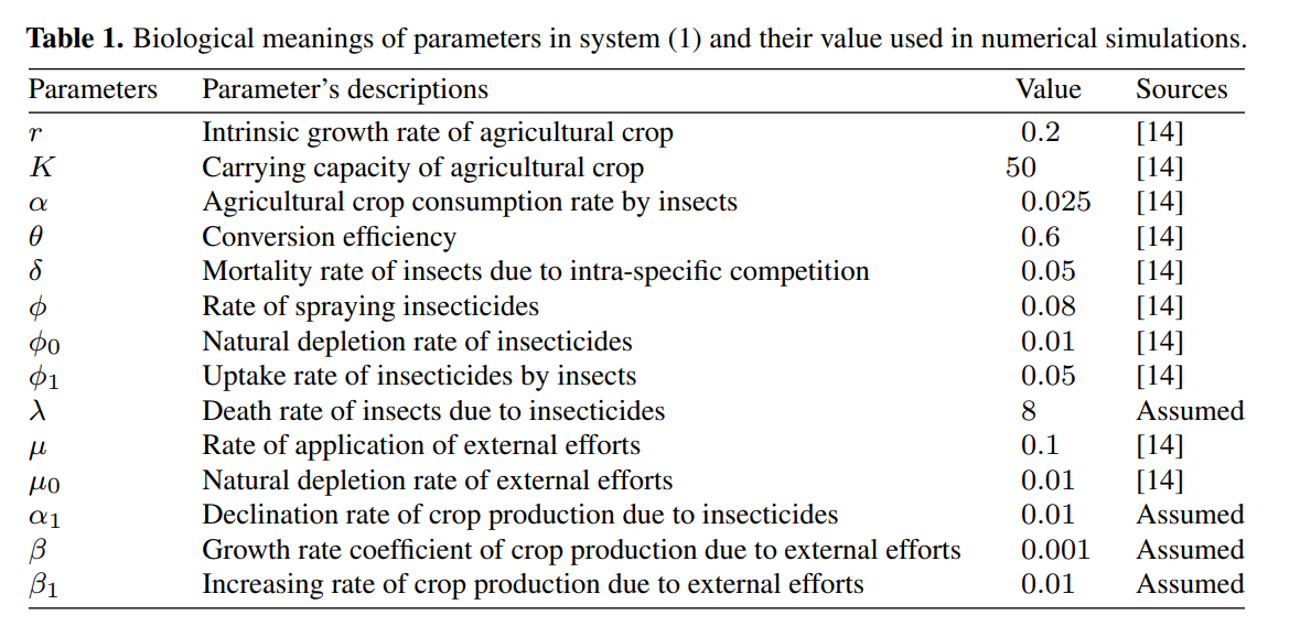 , have positive correlation with crop production. The agricultural crop consumption rate by insects α, conversion efficiency θ, natural depletion rate of insecticides