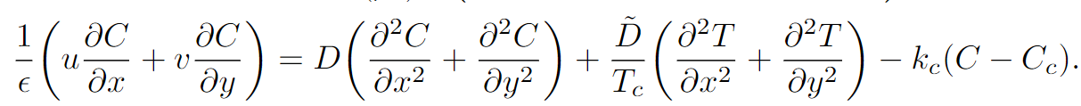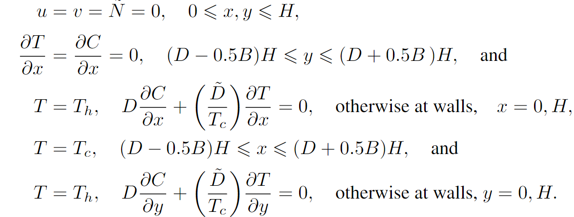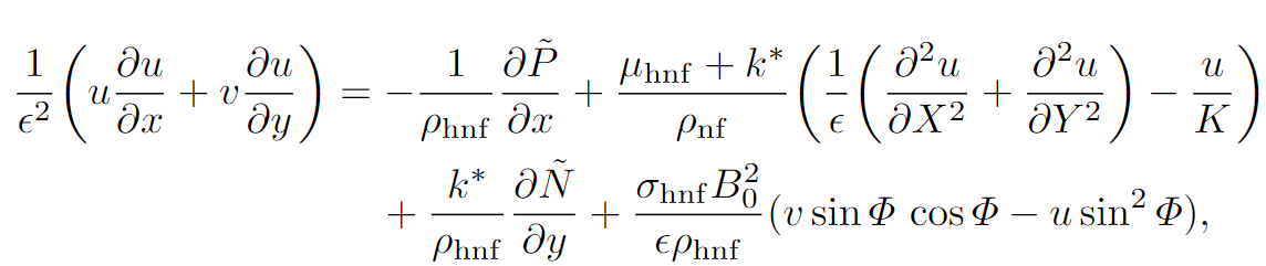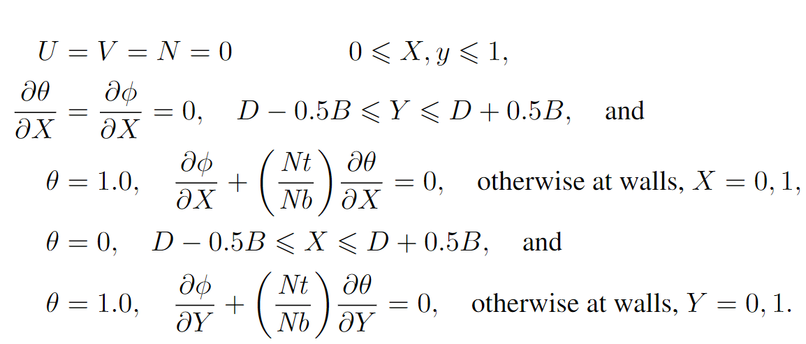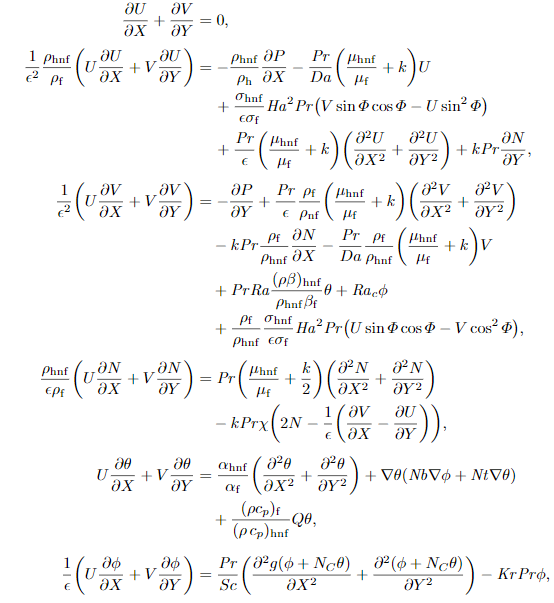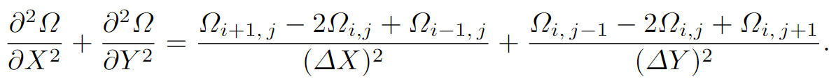 (13)In Eqs. (12)–(13), Ω refers to the dependent variables U , V , N and 0 and ∆X = Xi+1 -Xi, ∆Y = Yj+1 Yj. Using the previous forms, the following algebraic system is obtained: