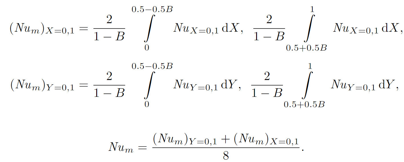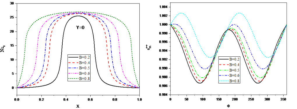 Figures 5(a) and 5(b) illustrate impacts of lengths of the active parts B on the local Nusselt number Nus along the horizontal walls and the ratio of the entropy generation ratio to the average Nusselt ratio at a horizontal magnetic field e++ at k = 0.5, Φ = 45◦, Q = 1, Da = 10−3, ϵ = 0.5, Nb = 0.4, Nt = 0.3. It is remarkable that the increase in B enhances gradients of the temperature, and hence, the rate of the heat transfer is enhanced. In addition, the increase in B enhances the ratio of the entropy generation ratio to the average Nusselt ratio at a horizontal magnetic field e++ due to the increase in the thermal boundary layers.