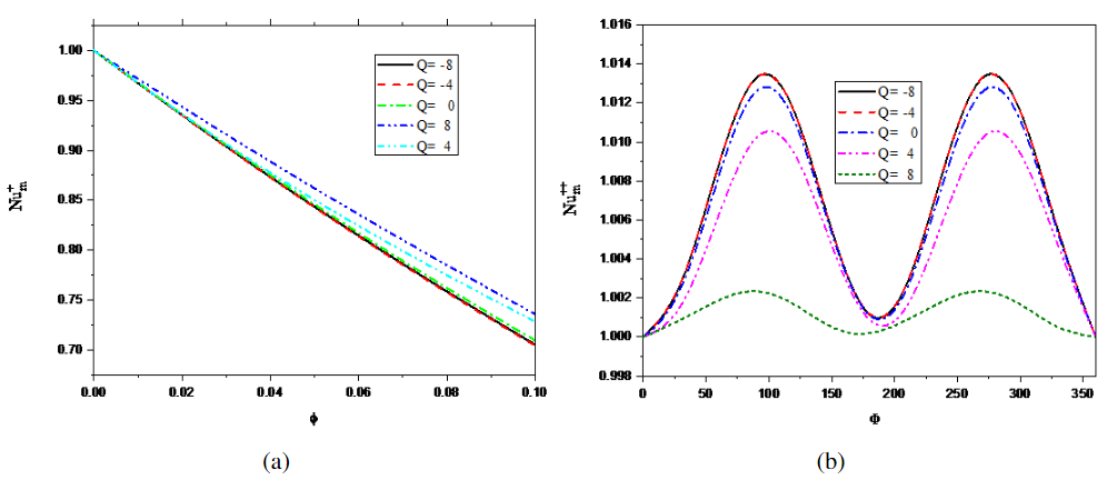 Figures 7(a), 7(b) and 8(a) expose profiles of ratio of the average Nusselt number to the average Nusselt at the pure fluid Nu+ , ratio of the average Nusselt number to the average Nusselt number at a horizontal magnetic field Nu++ and ratio of the entropy generation ratio to the average Nusselt ratio at a horizontal magnetic field e++ for variations of heat generation/absorption parameter Q. It is noteworthy that Nu+ is enhanced as Q is grown due to the increase in the temperature differences within the geometry. However, Nu++ is significantly reduced as Q increases, also, as mentioned previously, because of the inverse relation between e++ and Nu++. Figure 8(a) shows a clear support in values of e++ as Q is enhanced. The physical interpretation of this behavior is due to the extra heat generation in the flow domain as Q is increased, and hence, both the temperature differences and the buoyancy force are augmented resulting in an increase in e++.