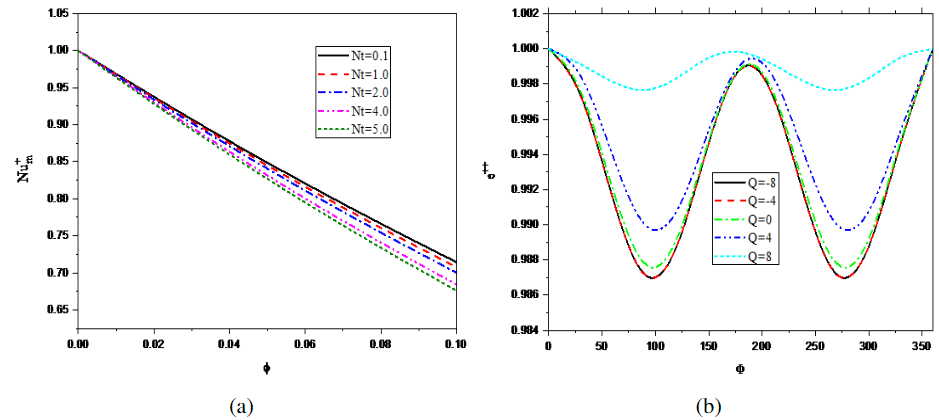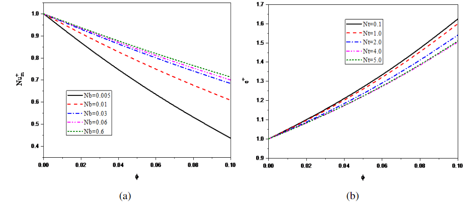 Impacts of the nanofluid parameters (Nt and Nb) on ratio of the average Nusselt number to the average Nusselt at the pure fluid Nu+ and ratio of the entropy generation ratio to the average Nusselt ratio at the pure fluid e+ are illustrated in Figs. 8(b), 9(a) and 9(b). The results revealed that Nu+ is diminished as the thermophores parameter Nt is increased, while the Brownian motion parameter Nb boosts values of Nu+ . Like effects of Nt on variation of Nt reduce values of e+