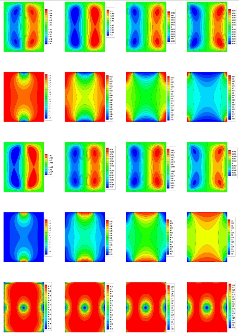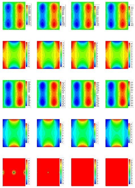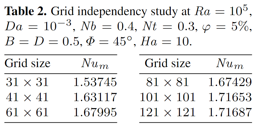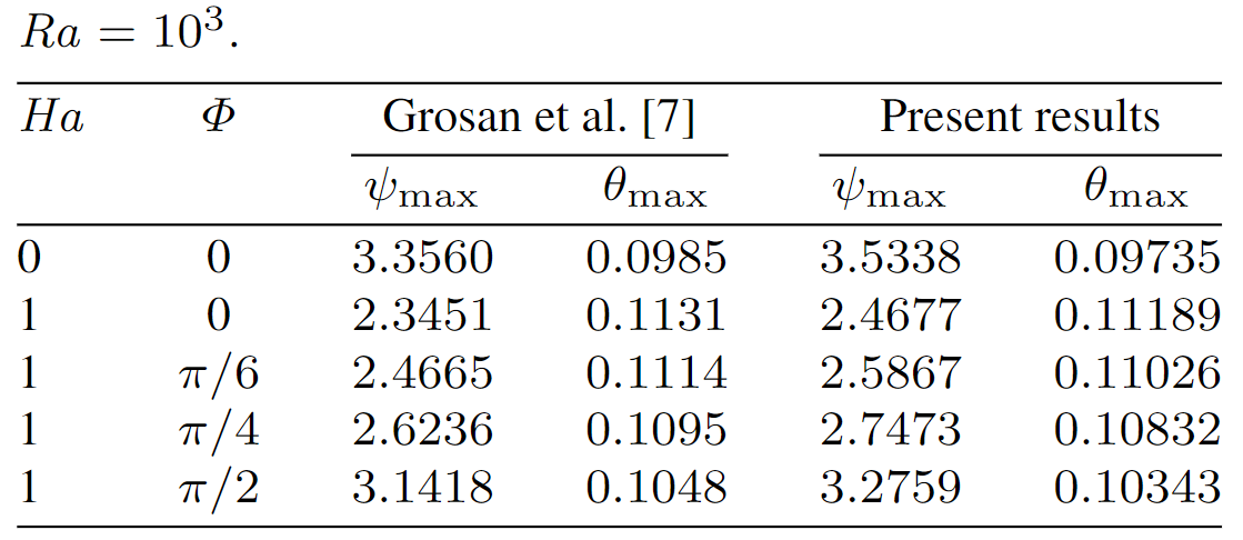 This test includes comparisons of the average Nusselt number with the results earned by Kim et al. [13] for variations of the Rayleigh number Ra. The table disclosed that the relative error in the results is ranging between 2.26% and 3.86%, which confirm the accuracy of the present results. Other comparisons are performed and presented in Table 4. In this table, maximum values of the stream functionψmax and temperature θmax for various values of the Hartmann number Ha and magnetic field inclination angle Φ are compared with those of Grosan et al. [7]. The results indicate to a very good agreement between the results is found.