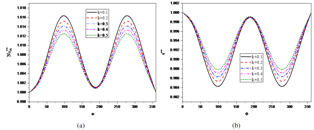 Figures 6(a) and 6(b) display profiles ratio of the average Nusselt number to the average Nusselt number at a horizontal magnetic field Nu++ and ratio of the entropy generation ratio to the average Nusselt ratio at a horizontal magnetic field e++ under effects of the vortex viscosity k. A clear reduction in values of Nu++ is obtained as k is increased due to the increase in the overall dynamic viscosity of the mixture. On the contrary, value of e++ is supported as k is grown due to the inverse relation between e++