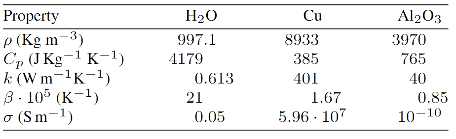experimental results allow us to select an appropriate model for a specified property. The effective properties of the Al2O3-water and Cu-water nanofluid are defined as follows [9]: