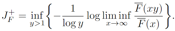 The following two indices are important to the determination whether d.f. F belongs to the aforementioned heavy-tailed distribution classes. The first index is the so-called upper Matuszewska index (see, e.g., [2, Sect. 2], [9, 23]), defined as