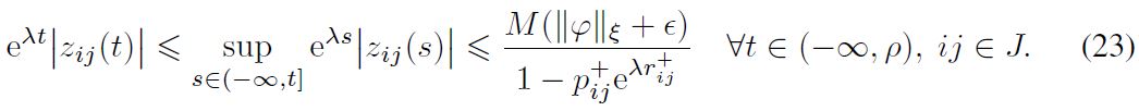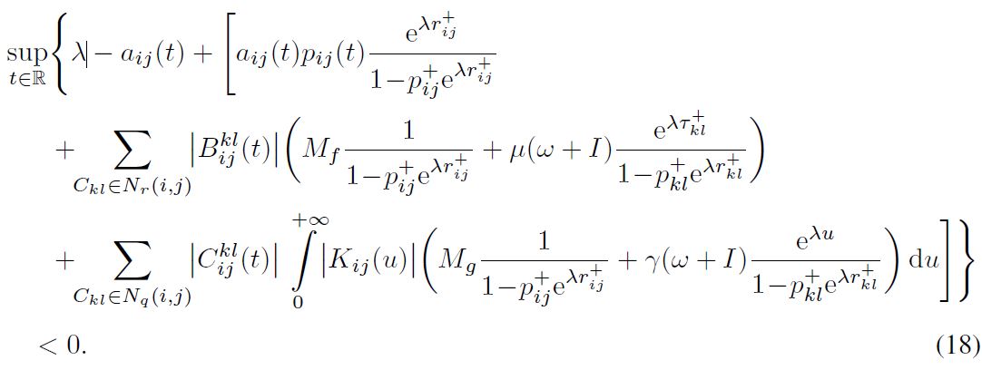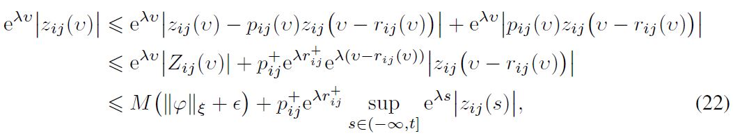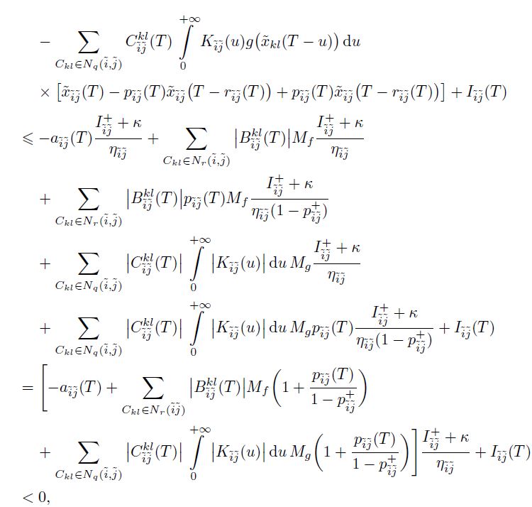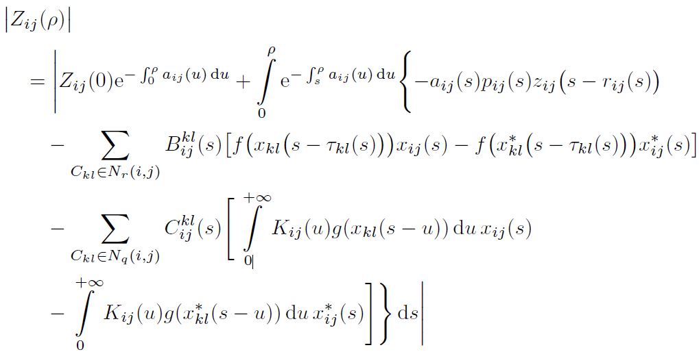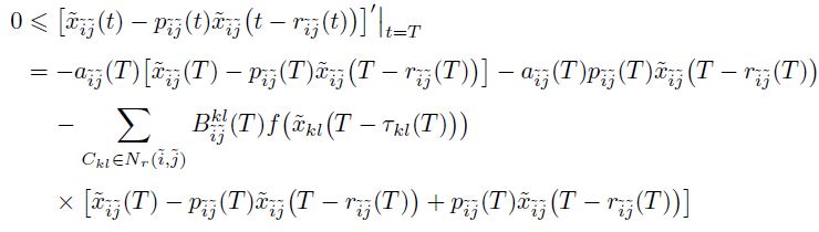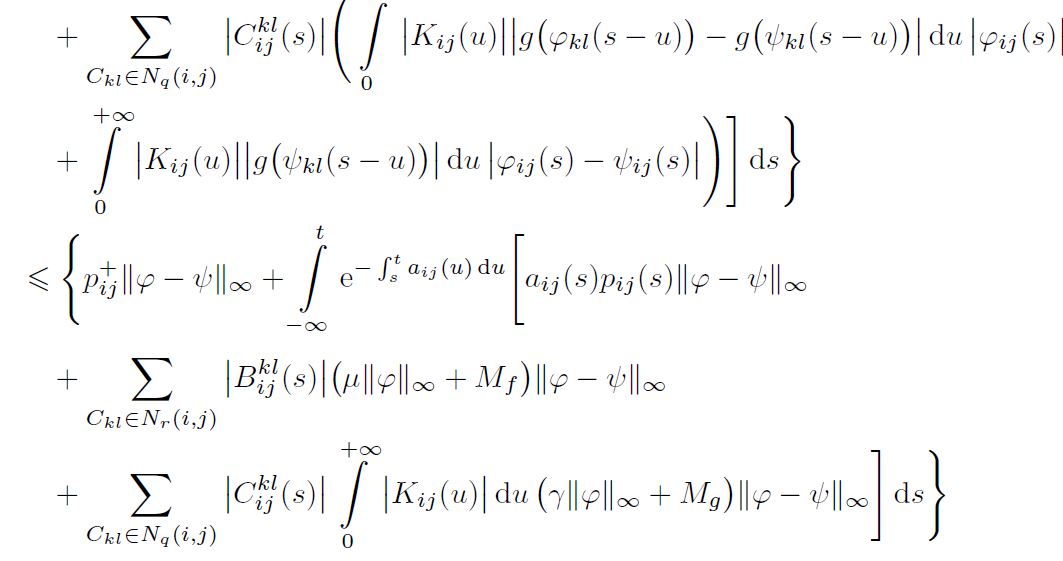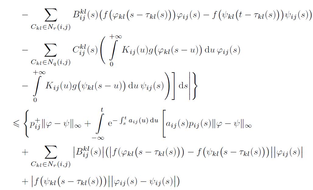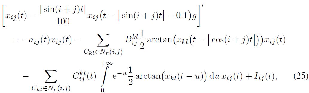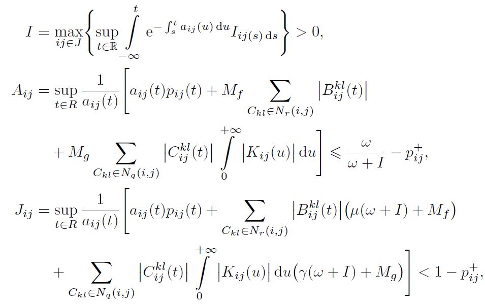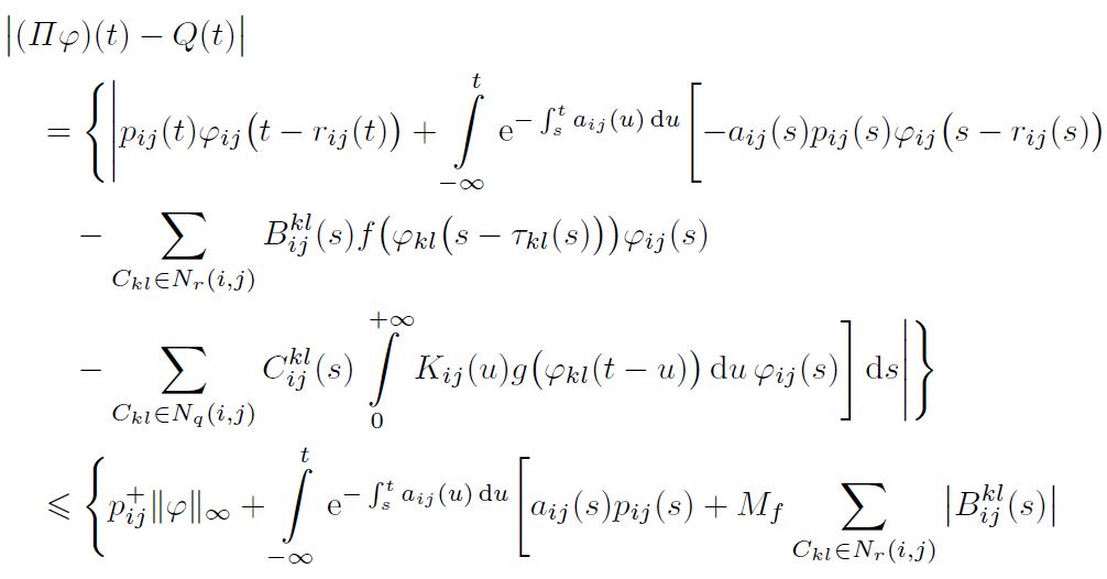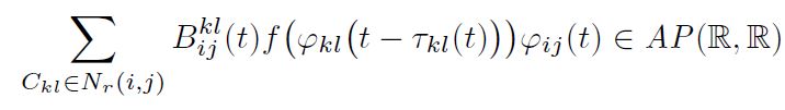 Remark 2. In Theorem 1, we firstly set up the positive stability of delayed almostperiodic SICNNs with D operator. So far, many achievements on the exponential convergenceor stability of delayed cellular neural network models have been revealed, see,e.g., [16, 23, 24, 26] and the related references. However, as far as we know, there isno result exploring the positive almost periodicity of SICNNs with D operator. Ourresults complement and improve some corresponding ones of the existing publicationsin [23, 24, 26].