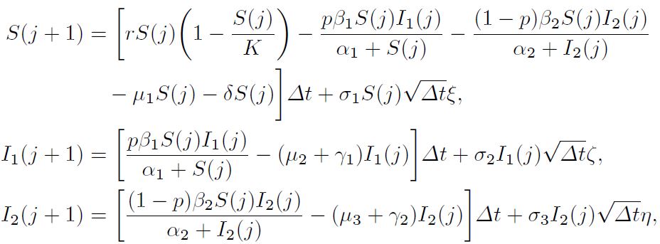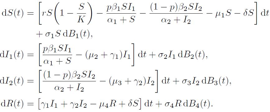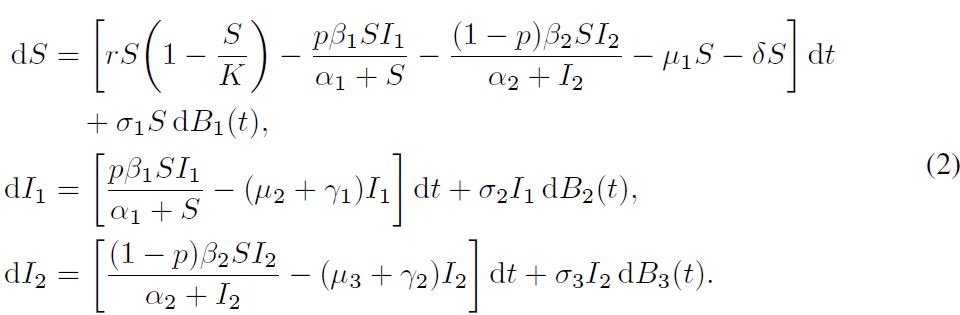 This work is just our preliminary exploration of how stochasticity affects the dy- namics of disease transmission. In order to have a more comprehensive understanding of the interaction between environmental stochasticity and the diseases, the following explorations are needed: (i) The type of stochasticity considered in this article is white noise, and in complex actual environments, there are other types of stochasticity such as telegraph noise [5, 17]. It has practical significance to investigate how these different types of noise synergistically affect the spread of diseases. (ii) This article only considers the situation of one type of susceptibles. Next, we can explore more complex scenarios such as by including more than three types of diseases [32]. (iii) This article assumes that stochasticity is positively correlated with the density of each component. Next, we can also consider the situation where stochasticity mainly perturbs the infection rate, which will induce a different stochastic system with degenerate diffusion terms, and its theoretical analysis is also more challenging.