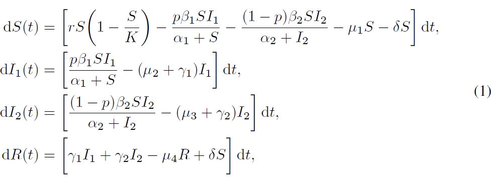 In classical epidemiological models, bilinear and standard incidence rates [28] are suitable for a small number of people in a short time, so many scholars use nonlinear incidence [2, 6, 7, 10, 16, 18, 21]. Logistic model [7] is more in line with the law of social population growth. In references [16, 21], the authors introduced the stochastic epidemic model with cross-infection of diseases. It has become a common phenomenon that people are infected with different diseases at the same time. On the basis of reference [2, 6, 7, 10, 16,18,21], a deterministic SIR model with cross-infection and permanent immunization is proposed in which the nonlinear incidence is used. The corresponding model is as follows: