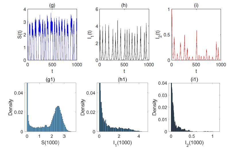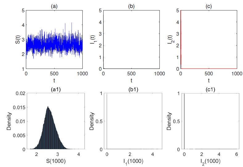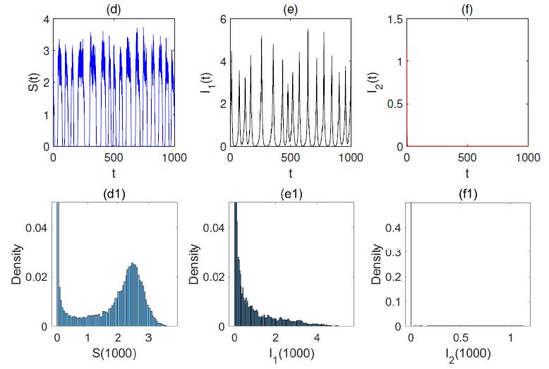 and the parameters meet some other con- straints (see Theorem 5 for detail), the stochastic system has a unique ergodic stationary distribution. Ergodicity means that the statistical properties of the stochastic system will not change over time, which allows us to estimate the contour of the stationary distribution by simulating a trajectory of the solution. In this scenario, the results also indicate that the small stochasticity is necessary for the existence of the stationary distribution, i.e., small stochasticity contributes to the survival of the diseases.