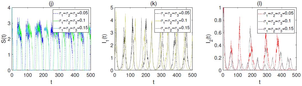, respectively, which indicates that environmental stochasticity is not conducive to the survival of the diseases. (ii) When