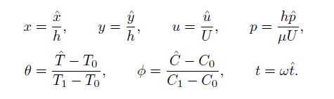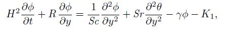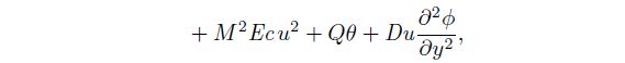 (8)where U is the characteristic velocity, are dimensionless temperature and concentration, is solutal Grashof number, is the radiation parameter, is the Hartmann number, is the Forchheimernumber, is the Eckert number,is cross flow Reynolds number,is the Soretnumber , is the chemical reaction parameter, is the Schmidtnumber,is the Dufour number, and