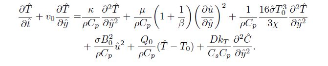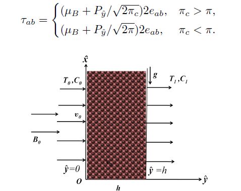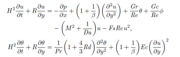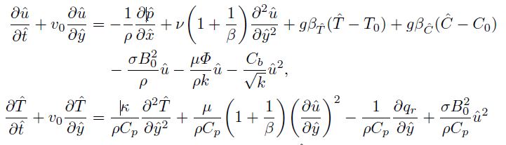 (3)where is the thermal conductivity, . is the dynamic viscosity,. is the electrical conductivity,. is the frequency,. is the kinematic viscosity,. is the density of the fluid, are the temperature and concentration of the fluid are the porosity and permeability of porous medium, is the coefficient of concentration expansion, is the coefficient of mass diffusivity, is the 1st-order chemical reaction rate, is time is the acceleration due to gravity ,