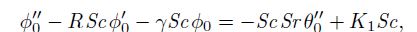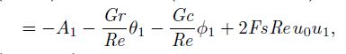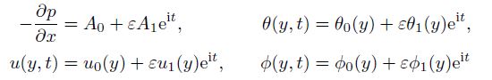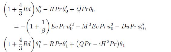 and neglecting higher orders. Here ϵ is the suitably chosen positive quantity, φ1(y) is unsteady concentration profile, θ1(y) is unsteady temperature profile, u1(y) is unsteady velocity profile, φ0(y) is steady concentration profile, θ0(y) is steady temperature profile, u0(y) is steady velocity profile, u is nondimensional velocity, and A0, A1 are positive constants.