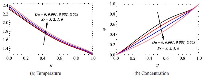Figure 4 illustrates the influences of Sc, Sr , and on concentration distribution. Figure 4(a) exhibits that the concentration profile decreases for given rise in Schmidt number. This is observed due to a rise in Sc that it turn makes the concentration boundary layer thinner than momentum boundary layer. Figure 4(b) depicts the influence of Soret number on. One can infer that φ is enhanced with increasing Sr . Figure 4(c) depicts effect on concentration. It is seen that the concentration falls with a rise in the destructive chemical reaction. The contrary pattern can be noticed for the case of generative chemical reaction. The effect of Du and Sr on the temperature and concentration distributions is shown in Figs. 5(a)–5(b). Figure 5(a) elucidates that a rise in Du with a decrease in Sr rises the thermal boundary layer growth. It is noticed from Fig. 5(b) that a decrease in Sr with a rise in Du has the tendency to decrease the concentration distribution. Physically, Soret effect reports that mass flux is made once a system is underneath a temperature gradient. Further, a rise in Du improves the convention velocity over combined influences of thermal and solutal buoyancy forces that leads to enhance the heat transfer but fall the mass transfer of the fluid.