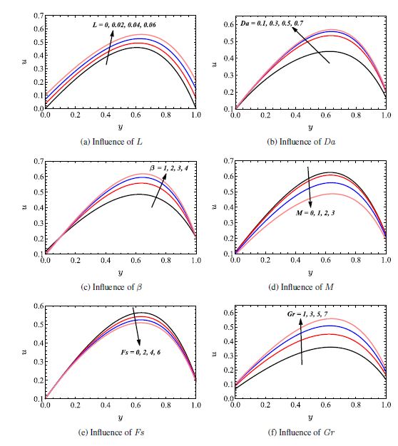 The influences of various physical parameters on velocity, temperature, concentration profiles are elucidated graphically in Figs. 2–5. Figures 2(a)–2(f) describe the impact of the slip parameter (L), Darcy number of the porous media (Da), Casson fluid parameter (β), Hartmann number (M ), Forchheimer number (Fs), and Grashof number (Gr ) on the velocity profile. Figure 2(a) reveals that an increase in L results in rise of velocity profile. Figure 2(b) elucidates that the velocity increases with an enhancing Darcy number. Figures 2(c) and 2(f) depict that there is an enhancement in velocity with an enhancing Casson fluid parameter and Grashof number. Figure 2(d) depicts that for a rise in M , there is a decrease in velocity. This can be because of Lorentz forces created by the applied magnetic field act as resistive drag forces opposite to the flow direction. Hence there is a decrease in velocity. Figure 2(e) delineates that a rise in Forchheimer number creates a resistance in fluid flow which results an abatement in velocity.