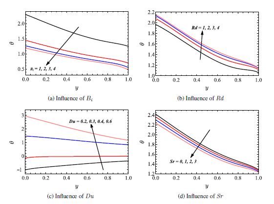 The variation of temperature distribution for various values of Bi, Rd , Du, and Sr are shown in Figs. 3(a)–3(d). Figure 3(a) illustrates the influence of B. on .. It is observed that for a given rise Biot number, there is a decrease in the temperature. A superior value