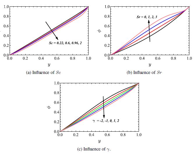 Concentration falls by enhancing Schmidt number and rises by rising the Soret number.