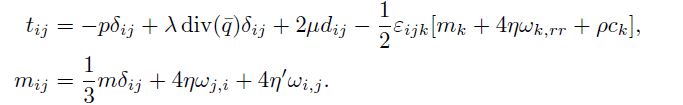 The couple stress tensor mijthat arises in the theory has the linear constitutive relation. In the above, is the spin tensor, is the body couple vector. These material constants are constrained by the inequalities