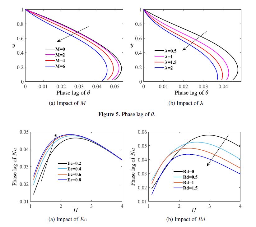 Phase lag of temperature is decreasing for the high values of M and λ. Phase lag of Nu is increasing with increasing values of Ec.