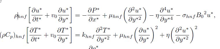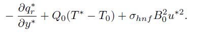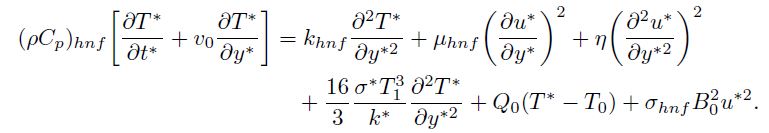 (3)Here is the velocity along the..-direction, represent density, dynamic viscosity, effective specific heat, thermal conductivity, and electrical conductivity of hybrid nanofluid, respectively, and the subscripts and s denote hybrid nanofluid, nanofluid, base fluid (blood), and solid nanoparticles, respectively. T*. . is the temperature of hybrid nanofluid,. is coefficient of couple stress viscosity,.. is coefficient of heat source/sink, and the radiative heat flux is denoted as .