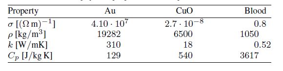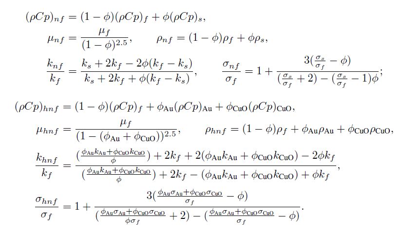 The thermal characteristics of blood, Au and CuO nanoparticles are specified in Table 1.The physical features of nanofluid and hybrid nanofluid are defined as [7, 10, 22]